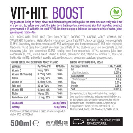BOOST is een heerlijke mix van zomerbessen, versmolten met water en een krachtige uitbarsting van ginseng en rooibosthee. BOOST bevat 0 mg cafeïne, omdat er geen natuurlijke cafeïne in rooibosthee zit.